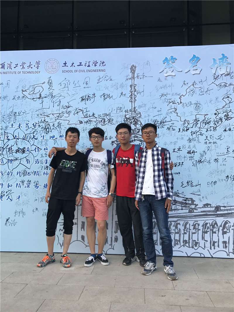 新生在签名墙前合影留念