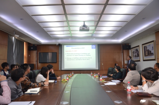 植松康教授的四个讲座分别为‘Wind-induced damage to buildings and structures in Japan focusing on cladding’‘Damage to buildings and structures due to unusual heavy snowfall in March 2014’‘Wind resistant design of 'Miracle lone pine tree’, a memorial of the Tohoku Great Earthquake 2011—An application of random vibration theory to the wind load estimation of structures’‘Design wind loads on H.P.-shaped free-standing canopy roofs’。第一个讲座中,教授介绍了日本风工程协会对风灾的调研详细阐述了受损建筑的破坏原因、受损特点及其在建筑设计中的重要性。第二个报告中,教授介绍了日本在2014214-16日的一次强降雪过程,他详细阐述了车棚在雪灾中的破坏形式,并解释了破坏原因,还基于日本的建筑结构荷载规范介绍了雪荷载估计方法。第三个报告中,教授介绍了东日本大地震后抗震纪念碑的结构设计过程,其中详细介绍了树形纪念碑的风洞试验方法、风荷载预测和风振响应的计算第四和讲座中,教授介绍了双曲抛物面屋盖的风荷载设计方法,其中阐述了屋盖的风洞试验设计、数值模拟方法风力系数的计算过程,他还重点介绍了屋盖中采用的新型膜结构以及此种膜材的风洞试验方法膜结构的选择提供了一种新思路。每次讲座的后五分钟为互动时间,植松康教授为员工们耐心地解答疑点,并和现场的老师们探讨了讲座中的问题