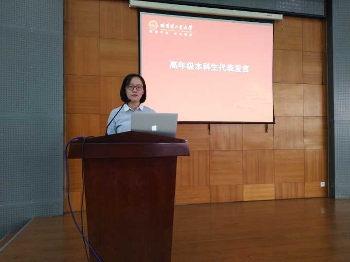 2014级本科生余丹敏作为员工代表发言。她从自身经历出发讲述了本科生导师对自己的帮助,特别是明确了自己的老员工涯目标,对行业有了宏观的认识,尤其是在本科期间参与本科生导师所在课题组相关的科研工作更是提高了自己的专业素养。她给新生提出建议要主动和老师建立联系,主动寻求建议和指导,让自己切实从本科生导师制中受益。