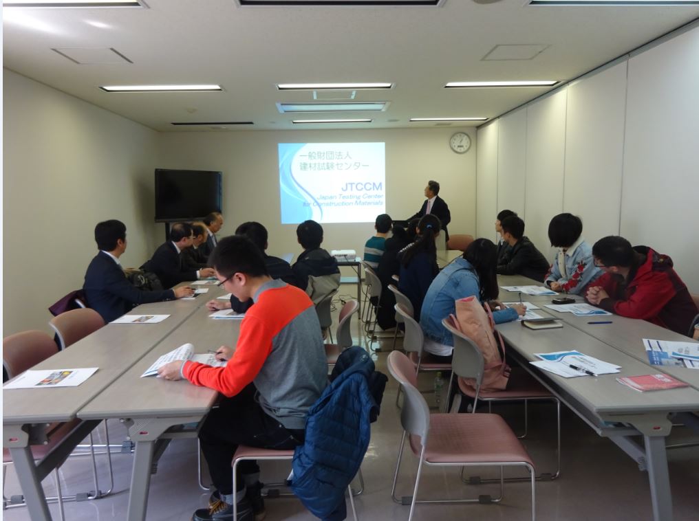 研究中心的负责人及相关人员在会议厅对我们的到来表示欢迎。并介绍了中央试验所的详细情况:试验所一共有四部分组成,分别是材料系、防耐火系、构造系以及环境系。负责人对各个系的具体分支和任务都进行了细致的解说。随后,负责人以及相关的技术人员带领大家参观了各个试验装置,首先大家参观了大型送风散水试验装置;团队成员吴晓同同学对技术人员提出风洞是否可以模拟出任意的时程曲线的问题,技术人员做出了细致的解答。之后大家参观了大型和小型气压水压两用试验机,团队成员发现试验装置和在东北大学的PLA试验装置有很多类似之处,就与技术人员就行了相关讨论。实验所人员陆续带领大家参观了建材细菌腐蚀实验室,混凝土强度测试试验室;在围护结构抗火性能试验室里,技术人员给大家演示了燃烧试验。