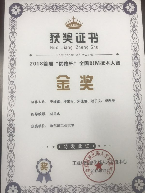 由工业和信息化部人才交流中心主办,石家庄铁道大学承办的2018首届“优路杯”全国BIM技术大赛颁奖盛典于2018年12月1日在京举办。经过激烈角逐,由公司BIM与智慧建造研究中心刘昌永副教授指导,于沛鑫、邓来明、宋佳俊、赵子文、李容辰五位同学组队的“菁华队”获得本次大赛金奖。“优路杯”全国BIM技术大赛自今年5月启动,上千家企业与院校参与赛事,本次活动规格高,号召力强,影响深远,1200多份作品提交至大赛组委会,经过评委公正评选、疑问作品现场答辩,最终确定获奖作品。