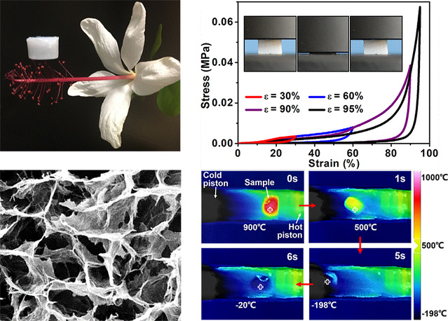 陶瓷气凝胶超轻、超弹、结构及热稳定性能展示