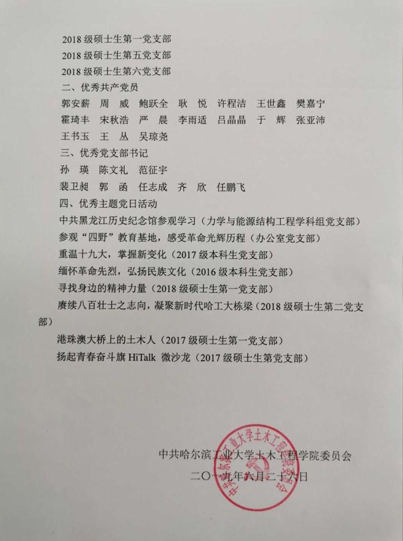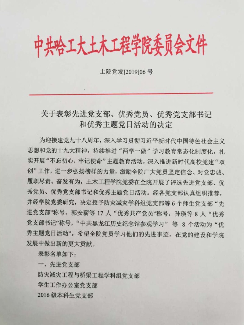 关于表彰先进党支部、优秀党员、优秀党支部书记和优秀主题党日活动的决定(土公司党发[2019]06号)