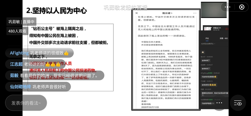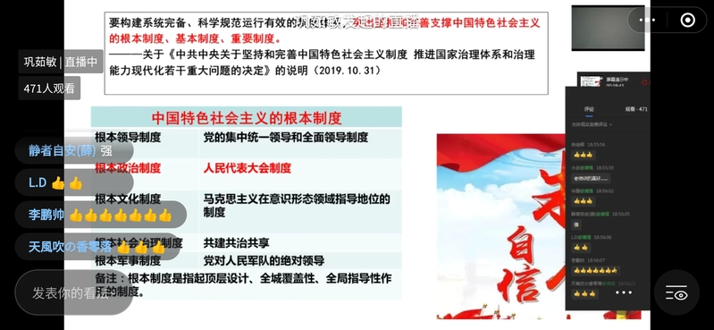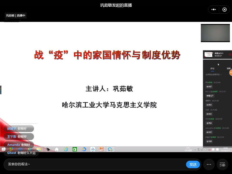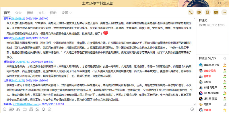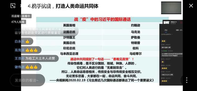 在谈到坚持党的领导的制度优势时巩老师说:“全国9000多万名党员、460多万个基层党组织,党中央一声令下,迅速行动,全员投入战斗,把初心和使命写在抗击疫情的第一线、写在了人民群众的心坎儿里,这速度之快、规模之大、执行之强、效果之实,世所罕见”;在谈到集中力量办大事的制度优势时,巩老师讲述了中国建造人用十天时间火速建成火神山医院的故事,引发线上土木学子的集体共鸣。