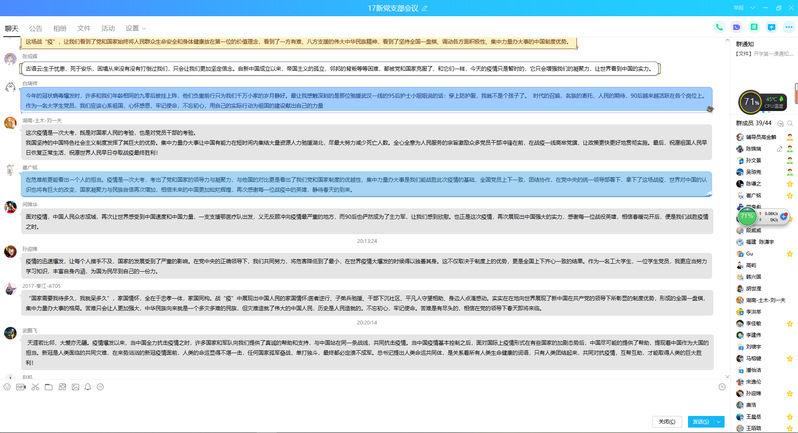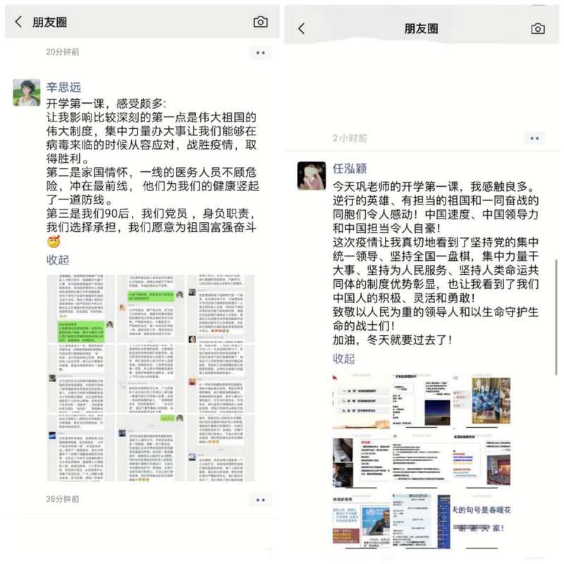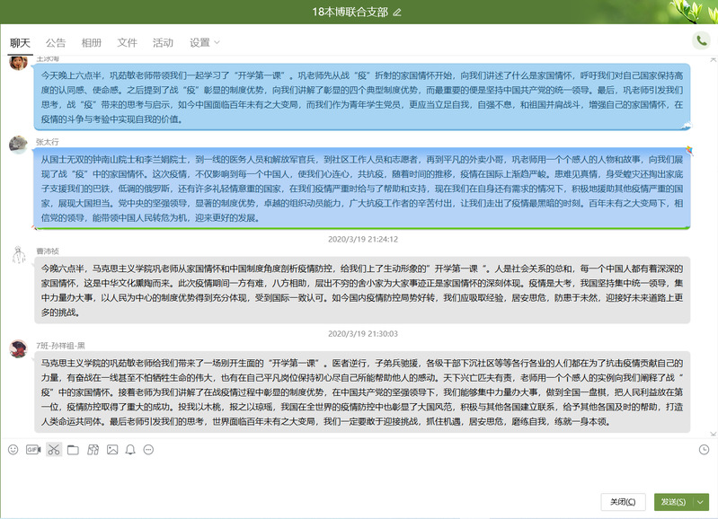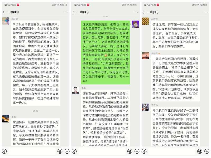 巩老师先与同学们分享了家国情怀的概念,她引用《孟子》等古籍中有关“忠孝一体、家国同构”等经典观点阐释了家国情怀的文化本质和内涵,从医者逆行、子弟兵驰援、干部下沉社区、平凡人守望相助等几个方面以及用“30钟南山院士、40的李兰娟院士、“90后”新生代力量等感人实例讲述了此次战“疫”过程中中国人民所展现出来的家国情怀。