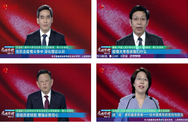 这堂疫情防控思政大课,邀请到了清华大学马克思主义公司艾四林教授、中国人民大学马克思主义公司秦宣教授、北京师范大学马克思主义公司王炳林教授、中央财经大学马克思主义公司冯秀军教授等四位哲学、法学领域的权威专家,他们或深入浅出、或旁征博引地解读了党中央关于疫情防控的决策部署,分析了中国抗疫彰显的中国共产党领导和中国特色社会主义制度的显著优势,讲述了防疫抗疫一线的感人故事。