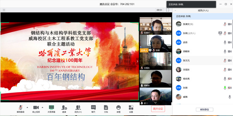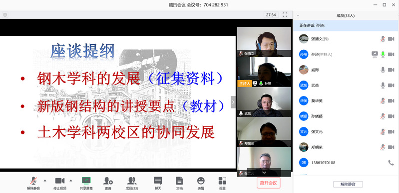 钢结构与木结构学科党支部书记孙瑛教授主持了本次会议,首先介绍了参会的人员,强调了活动非常之处是首次本部和威海支部联合开展云端互动活动。孙瑛书记先简要回顾了百年土木的历史,分别介绍了本部钢结构与木结构学科和威海校区土木工程系的发展历史。从建国初陈雨波教授作为哈工大土木系最早从事钢结构教学和科研工作的教师之后,到目前为止一共有55名教师从事钢结构教学和科研工作。在钟善桐、沈世钊和张耀春三位老一辈钢结构专家的带领下,形成了“大跨空间钢结构”、“高层建筑钢结构与轻钢结构”、“钢管混凝土结构与组合结构”三个在国内外均具重要影响的特色研究方向和团队。通过团队式建设,家长式管理,共建和谐的大家庭,自2000年以来,在新一代中青年专家的努力下,独具特色的哈工大钢结构课程群体系逐渐形成,以钢/木结构的设计原理为中心,逐渐拓展出了很多专业和创新课程。孙瑛书记通过共享一组旧照片,旨在唤起很多老师的回忆,本次会议的主要目的之一也是为百年校庆宣传做动员工作,尽可能多地收集一些有意义的历史资料,组织更多地人员参与到校庆的准备工作中。