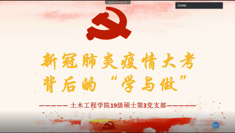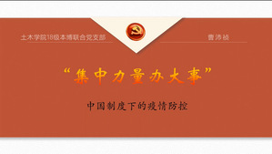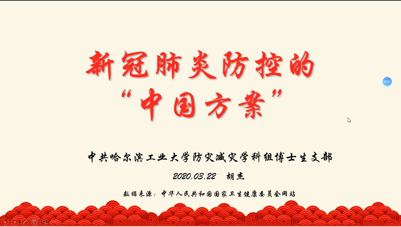 196支部以党课讲解的形式开展以学习习近平总书记关于疫情防控做出的重要讲话精神为主题内容的党日活动,191支部以“集中力量办大事”为主题,支部成员通过党课深刻认识在疫情防控中彰显的中国制度优势,195支部通过党课学习了中国人民面对疫情所展现的伟大民族精神,193支部以新冠肺炎疫情大考背后的学与做为题讲述党课,防灾减灾学科组博士生支部从指挥体系、防控策略、救治能力、依靠人民等八个方面讲述新冠肺炎防控的“中国方案”。