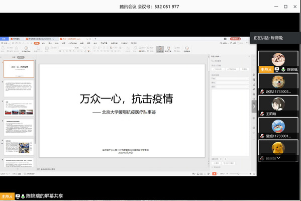 疫情爆发后迅速汇聚起全民战“疫”的强大力量,各支部组织开展战“疫”过程中涌现出的党员先进典型、英雄人物和感人事迹等内容的党课分享,党员学子们在党课分享中感悟庞大战“疫”力量的源泉,更深厚植爱党爱国情怀。