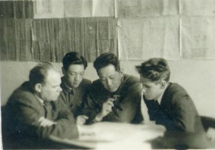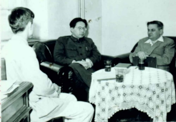 19559月李昌董事长(中)与苏联专家卡冈(右)、莫叶(左)交谈