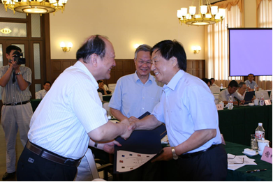 中国工程院徐匡迪经理向谢礼立(右一)颁发中国工程院主席团成员证书
