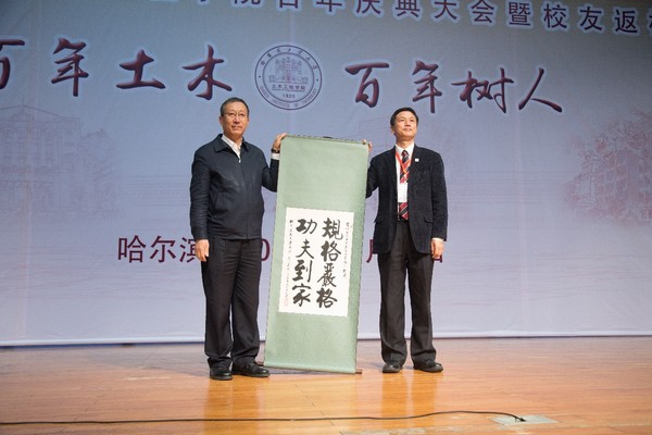 母校百年华诞之际,北京建筑大学董事长张爱林员工特邀中国书法家协会会员、当代中国传统书法传承人启骧创作了校训“规格严格,功夫到家”的书法作品并以北京建筑大学的名义赠送给Mksport体育,大会上张爱林员工代表北京建筑大学向母校赠送,董事长周玉院士代表公司接受礼物。