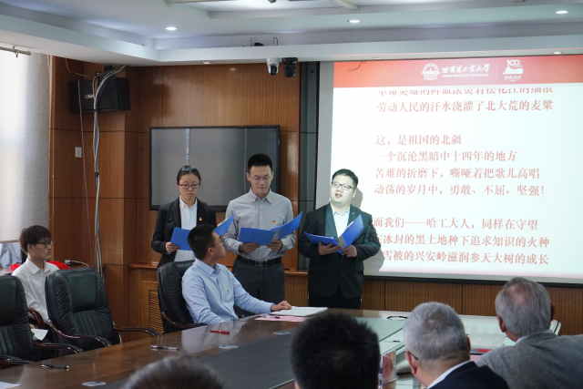 接着,支部成员为所有与会的老师和同学们献上了精心准备的原创诗朗诵《传承》, 致敬一代又一代拼搏奉献的哈工大人。“当爱国奉献的精魂熔铸满园芬芳,当地月同拍在年轻的心灵上闪亮,当天眼的目光投向苍茫宇宙……”, “愿做祖国科技发展的基石栋梁,愿春风化雨换得中华桃李芬芳,愿用勤劳的双手开辟书山通途,愿将身躯化作明灯,点亮学海光芒……”,三位领读同学声音洪亮,饱含深情,在座的老师和同学无不为之动容。
