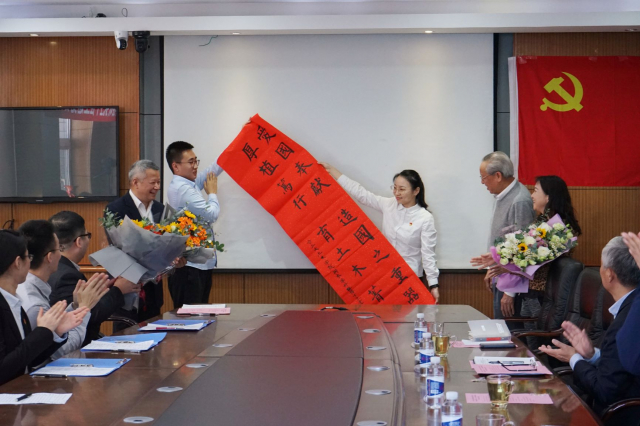 交流过后,支部成员为三位老师献上鲜花以及原创书法作品一幅,“爱国奉献,造国之重器;厚植笃行,育土木菁华”,简短的18个字是对师长们爱国奋斗、立德树人精神的凝练,更表达了支部成员的深深敬意以及接力奋斗的决心。