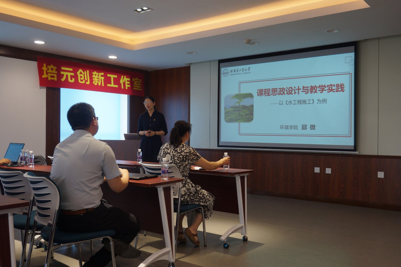 邱微老师赵威老工大届及第二届课程思政竞赛特等奖获得者,对课程思政的学设计、课程思想引导都有着很丰富的经验。邱薇老师以《水工程施工》为,向大家分享了自己在课程思政建设过程中的心得与体会,认为课程思政建设的第一步,是要对课程的基本概况与定位有一个清晰的认识,如此才能开展具有针对性的课程设计。在课程思政的实施过程中,邱薇老师根据自己长期的积累,建立了两个课程思政元素库,分别收集我国重大工程实践、时政要闻、校史校训、八百壮士精神等方面的案例,并举例说明如何根据课程思政的要求按需取用,在恰当的地方自然地引用相关案例,做到在讲授专业内容的过程中自然而然地给员工进行思想政治方面的教育与熏陶,达到课程思政的效果。最后,邱薇老师以《室外给排水管道施工方法》的讲授作为案例,向大家展示了如何在课程专业内容讲授的基础上融入课程思政的内容,使大家受益匪浅。
