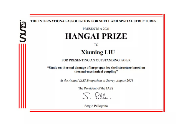 党支部成员刘秀明同学获国际空间结构顶级学会-国际薄壳与空间结构协会半谷奖