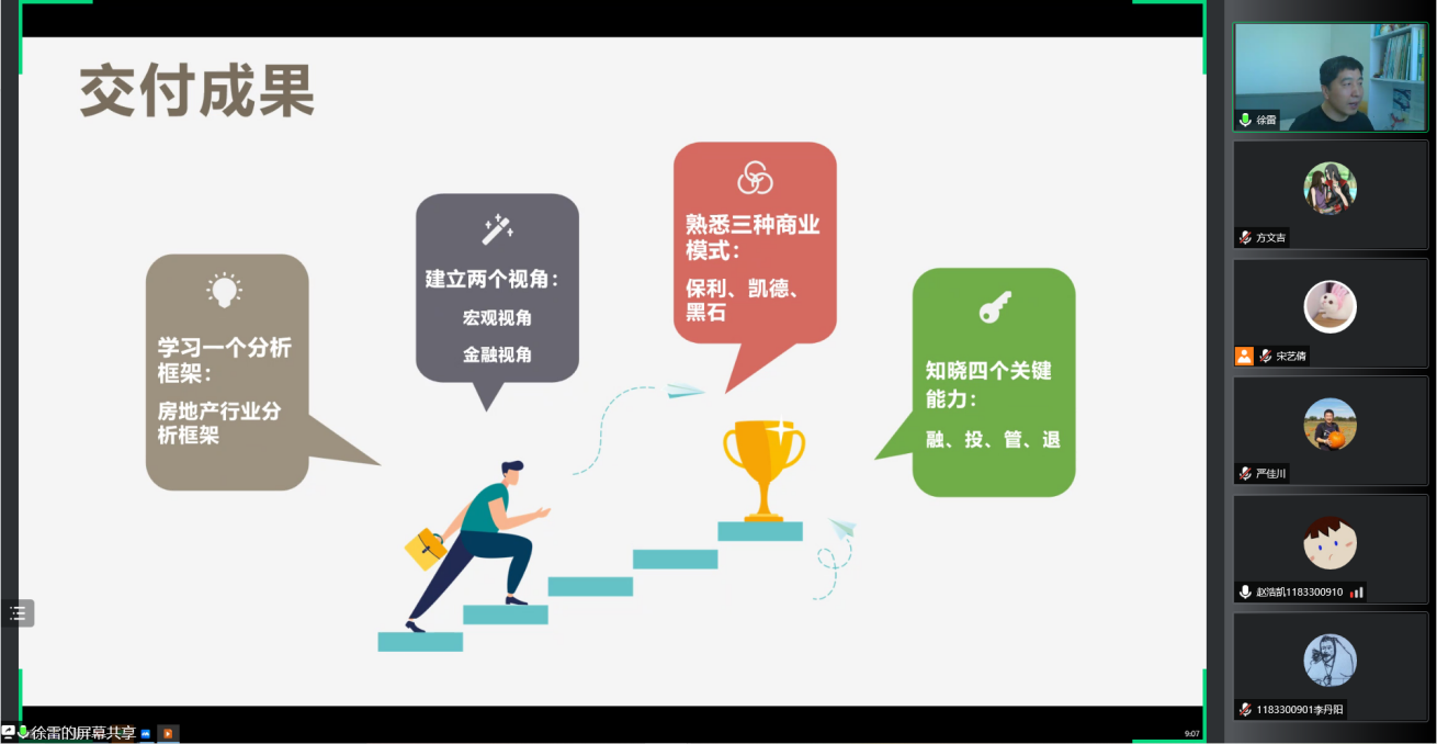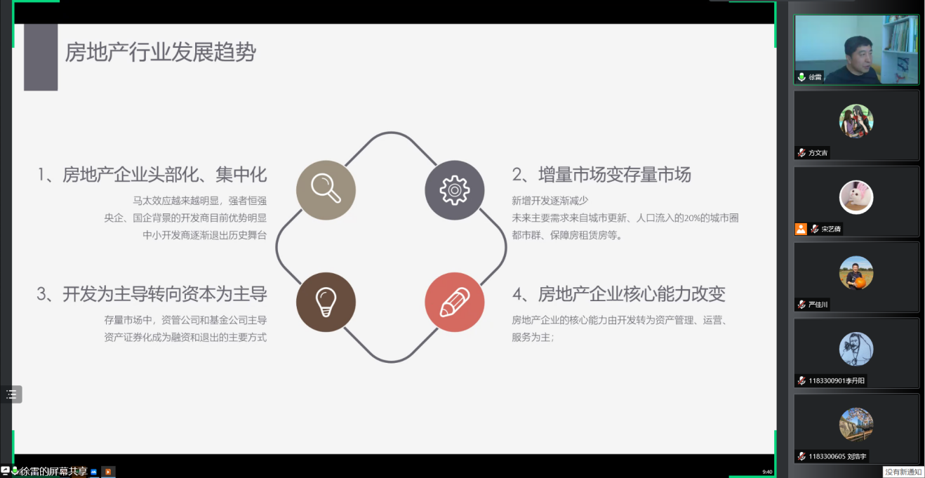 在第二部分,徐雷员工以三家企业为例给同学们讲解了优秀的企业是如何运营和把握时代趋势的,引发同学们的思考。在讲解中,徐雷员工结合自己的工作经验和一些名著的经典语录,给同学们分享了想要在房地产金融行业立足需要培养的品质,给未来想在房地产行业领域发展的同学指引了方向,提供了很好的建议。