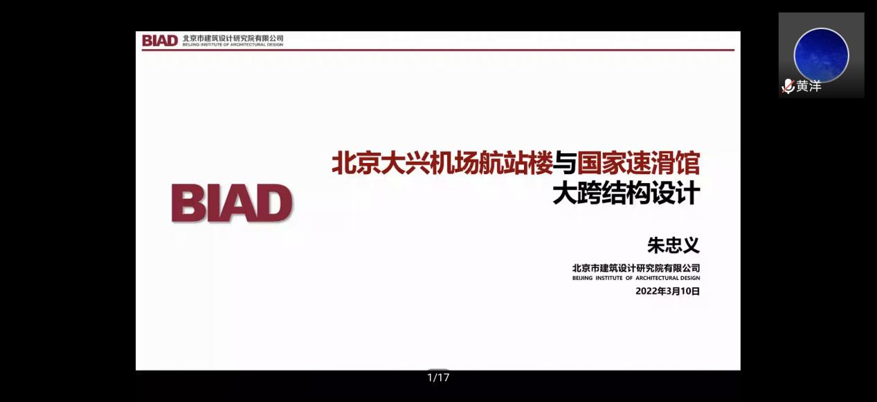 朱忠义以“北京大兴机场航站楼与国家速滑馆大跨结构设计”为主题主讲报告,讲座共分为两个部分。在第一部分,朱忠义讲解了北京大兴机场航站楼大跨结构设计过程,讲述了工程概况、设计挑战、大跨度结构设计及隔震设计。朱忠义介绍了机场地理位置、建筑结构尺寸形状同时引出机场设计的三大挑战和四项关键技术难题,并结合中心区大跨度结构的设计过程做了详细解读。