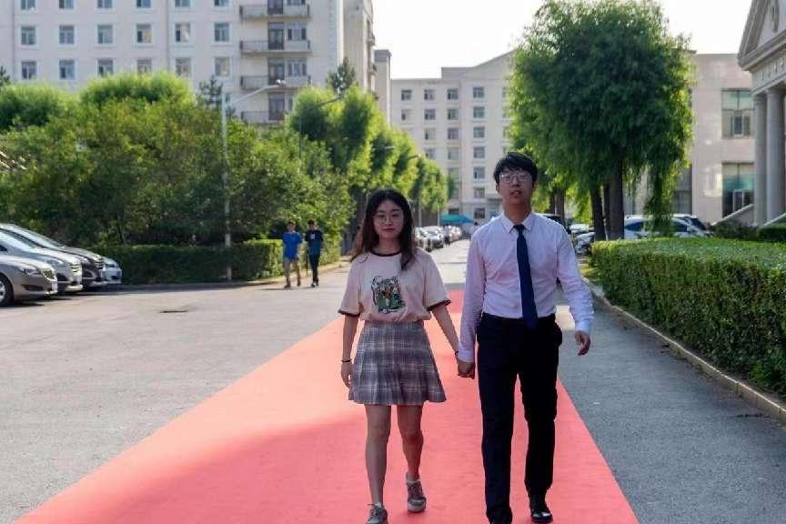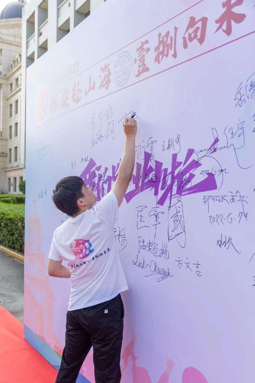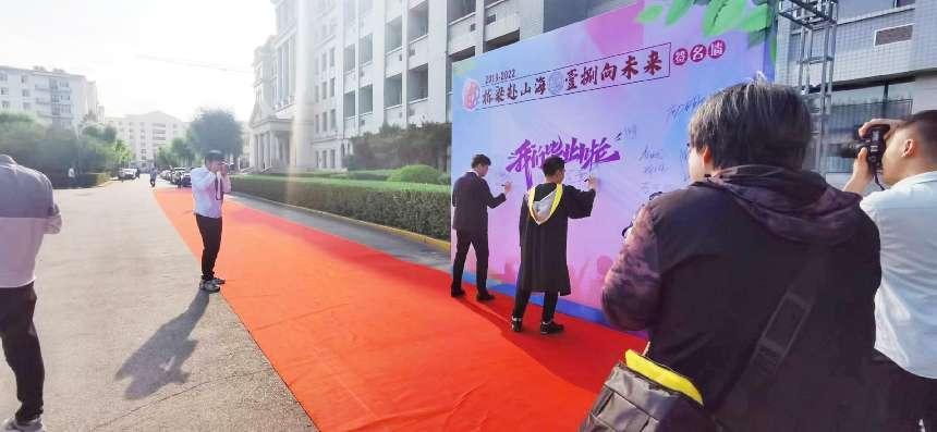 6月14日下午,毕业生和老师们缓缓走过红地毯,在签名墙上签名合影留念。2022届毕业生们穿着正装、毕业文化衫或民族服饰,在闪光灯下留下了最美好的记忆。