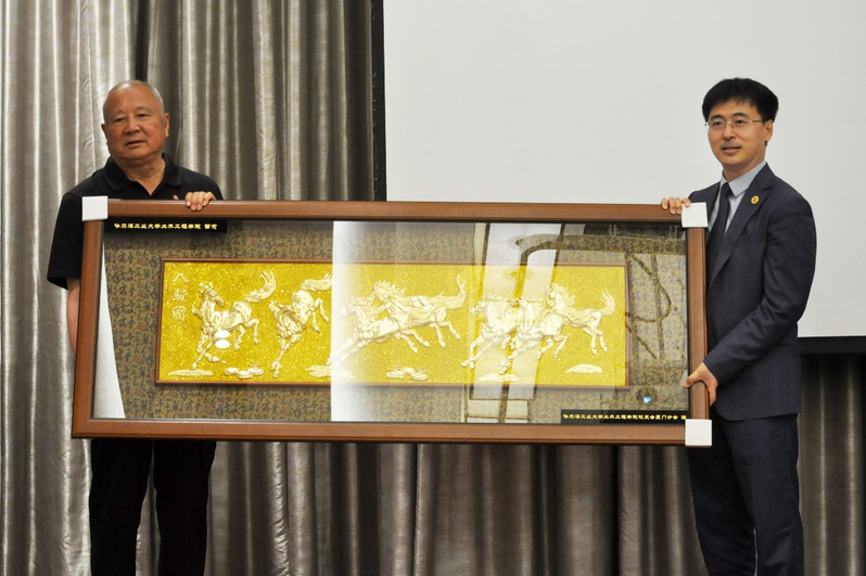 会长魏雅丽代表哈工大MKsports员工会厦门分会及全体在厦门的土木员工们,向公司捐赠具有浓厚厦门特色的礼物,厦门漆线雕“八骏图”,祝愿母校蒸蒸日上、蓬勃发展!