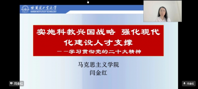 闫金红结合党的二十大报告中关于教育、科技和人才三位一体的重要论述,围绕党的二十大报告对于教育、科技和人才的文本解读,我国教育、科技工作取得的成就和发展规划和培养高素质人才、筑牢强国建设之基等三个方面深入展开,为全体师生讲授。