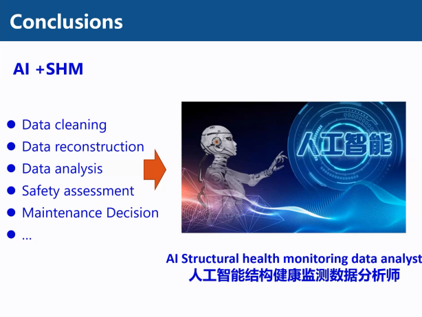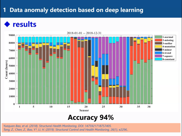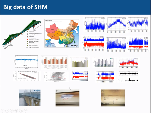 鲍跃全教授从结构健康监测的发展背景讲起,指出了健康监测能够评估结构健康状况、掌握结构安全性,是后期运营维护的重要指标,对未来土木工程以及智慧城市的发展有重要指导与启发意义。鲍老师认为,数据可以表达结构的状态,是对结构的全方位观测,通过利用深度学习等算法可以对结构监测产生数据的筛选、清洗、重构,可以较好地还原结构的实时状况,能够大幅提高对结构健康的掌握状况。接着介绍了课题组一篇高引用文章的撰写思路,呼吁在将来数据处理中多使用人工智能进行数据分析,最后介绍了结构健康检测领域的国际竞赛,希望更多的人能参与进来。