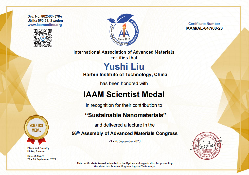 国际先进材料学会(IAAM)是全球先进材料领域著名国际性学术组织,总部设在瑞典。学会聚集了世界范围内材料科学与技术领域的优秀科学家,致力于为先进材料科学、工程和技术在世界范围内的快速发展提供高水平学术平台,是材料科学领域各类学科领军人才的聚集地。目前国际先进材料学会拥有来自超过125个国家的80000多名会员。“IAAM Scientist Medal”是该学会授予杰出科学家的最高级别奖章,获得该奖项的学者包括多位国际知名大学讲席教授、国家级高层次人才。“IAAM Scientist Medal”是由国际先进材料学会根据研究人员近10年来在先进材料领域所做的工作在世界范围内进行提名和评选,最终授予在先进材料科学与技术领域做出重要贡献的研究人员,以表彰他们在专业领域取得的显著成就。