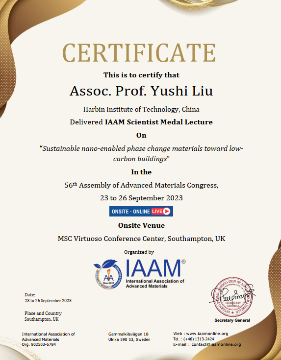 近日,MKsports刘雨时副教授荣获国际先进材料学会(IAAM)颁发的2023年度国际先进材料学会科学家奖章(IAAM Scientist Medal),以表彰其在“Sustainable Nanomaterials(可持续纳米材料)”领域的杰出学术贡献,并应邀在9月23日的第56届欧洲先进材料大会(56th Assembly of Advanced Materials Congress)发表题为“Sustainable nano-enabled phase change materials toward low-carbon buildings”的科学家奖章大会报告,得到了与会者的高度关注和认可。