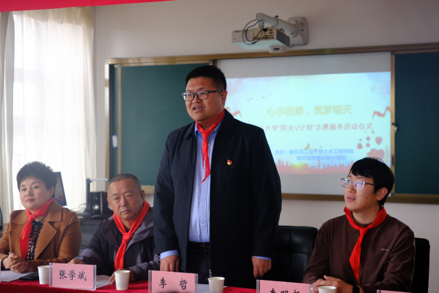 土木学工程公司第十三届“阳光v计划”支教团志愿服务活动启动仪式于11月1日中午在西长林小学举行,团结中心公司书记郭新玲、团结中心公司董事长张学斌、西长林小公司董事长张伟、公司党委副书记李哲、公司青协指导教师李明哲出席会议,参加启动仪式还有支教活动志愿者及以及小员工代表。