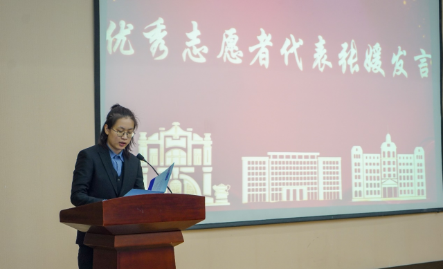 优秀志愿者代表张媛在大会上做分享,她由自身志愿服务经历谈及了自己在疫情防控期间,紧急事故救援队,小红帽迎新等志愿服务中的感想和收获,勉励广大志愿者继续投身志愿服务。