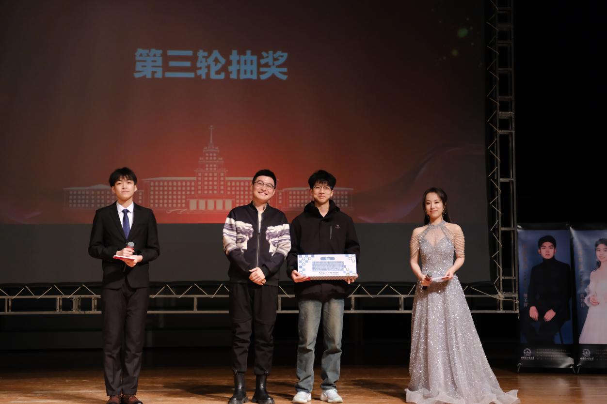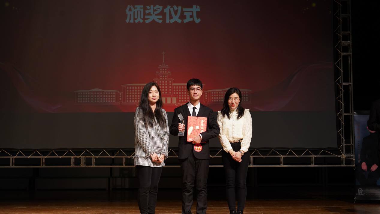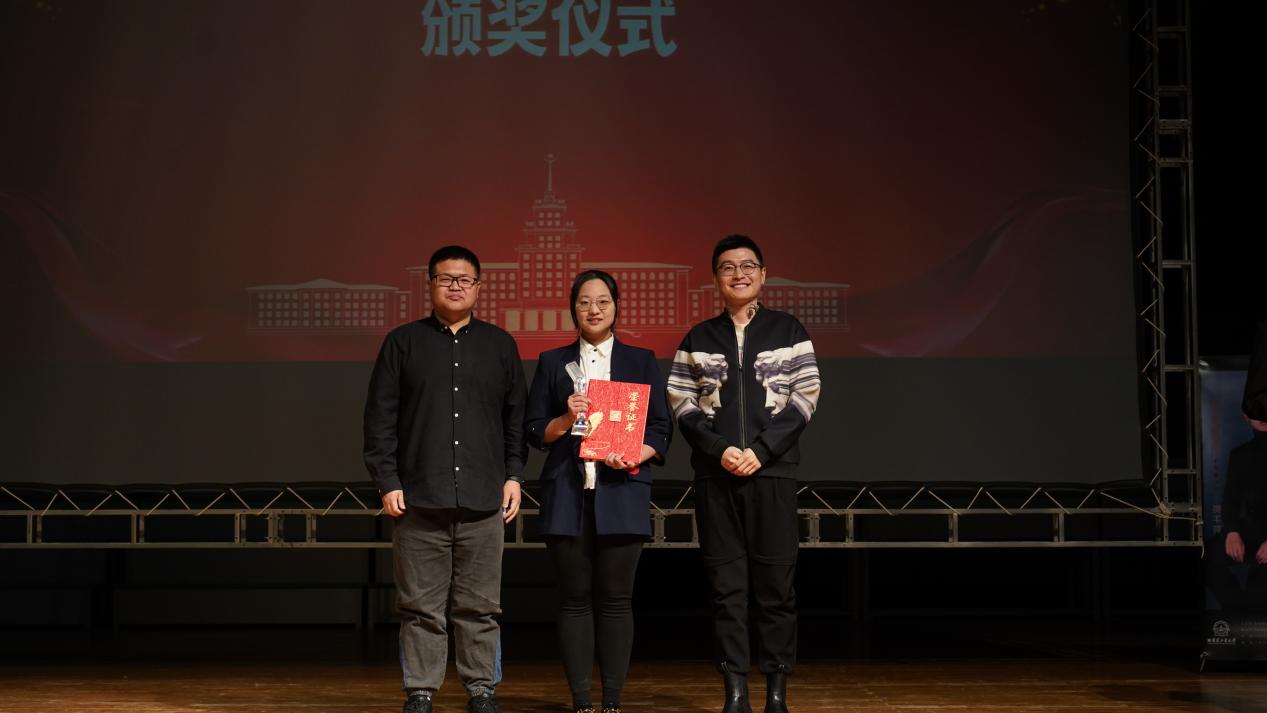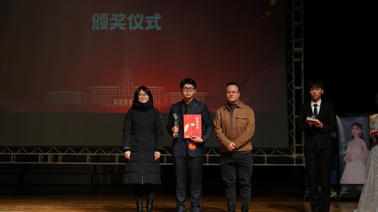 黑龙江广播电视台主持人杨彦军和校团委副书记李梦晗为十大演讲家冠军颁发奖杯和荣誉证书