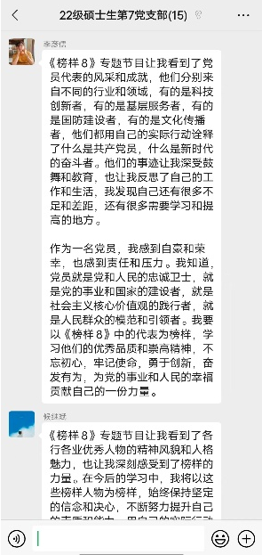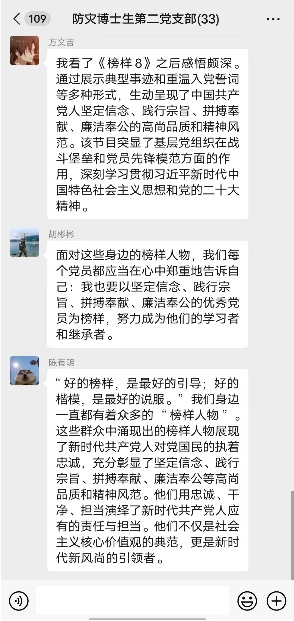 全国第三批党建“双创”样板支部空间结构研究中心博士生第二党支部书记郭鸣谦表示:观看完《榜样8》专题节目,钱七虎等6位党员以及浙江余姚横坎头村党委无私奉献、坚强拼搏的事迹深深打动了我。其中钱七虎院士深耕60载,为国铸盾的事迹深深打动了我。作为一名博士生党支部书记,要瞄准国家重大战略需求,要把个人理想和国家、民族的命运结合起来,展现共产党人的高尚品质,发挥党员先锋模范与基层党支部的战斗堡垒作用。