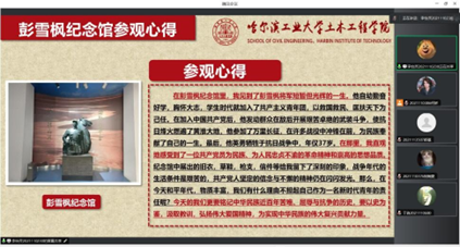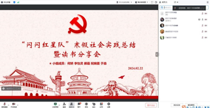 2月22日晚,小组线上进行了寒假社会实践总结暨读书分享会。在会议上,每一位小组成员对自己的实践地点做了简要介绍,并分享了在参观过程中的心得感悟。寒假期间,小组成员还阅读了《红星照耀中国》《苦难辉煌》《为什么是中国》《毛泽东选集》《梁家河》等书籍,体会中国从百年沧桑到民族复兴的曲折道路,感悟中国共产党最终走向胜利的关键,传承中华民族经久不息、忠贞不渝的爱国精神。