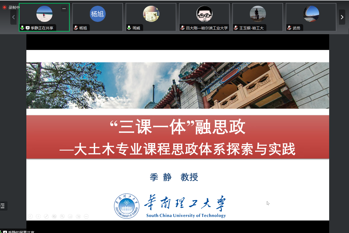 季静教授从立德树人的重要性讲起,以教师如何进行课程思政、高校如何全面推进课程思政为切入点,详细介绍、评析了华南理工大学“明道育德”的专业课程教学改革的统筹设计方案与“四个一”试点的课程思政实施方案。季静教授分享了专业课程思政体系构建的“思政第一课、思政贯通课、思政课外课”的“三课一体”体系与实施路径。以《混凝土结构理论》、《交通设计》、《钢结构原理》等课程的方法为实例,详细讲解了落实思政目标的经验与技巧,如结合时政热点、师生共建课程思政学堂、依托党支部建设“课程思政+党建”模式等。