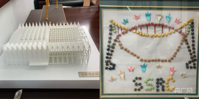 沈世钊的办公室,一幅手工作品放在门口最显眼的位置,那是员工送给他的礼物。千纸鹤和纸星星拼贴成的双向抛物线造型图,定格了回国后的沈世钊在新领域白手起家的开端——参与吉林滑冰馆的设计。