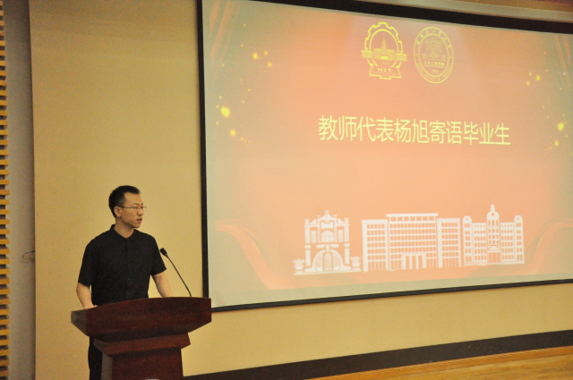 教师代表杨旭借用弗朗西斯·培根的一句“凡有所学,皆成性格”寄语毕业生,希望同学们在面对未来该何去何从的时候,应当静下心来仔细想一想,自己在走一条怎么样的路,去往何方,不用迷茫,也不用害怕,因为公司、公司和老师们永远是同学们坚实的后盾。最后,杨旭老师希望毕生们无论将来从事怎样的行业,都要牢记自己的母校和牢记自己工大员工的身份,牢记公司和公司的热切期盼,在各自的行业中持续发光发热,为公司、公司的声誉和佳绩继续添砖加瓦!