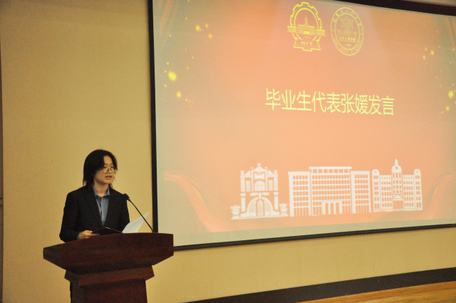 毕业生代表张媛在发言中表达了对集团、公司和老师四年培养的感恩,她回忆了本科四年的学习生活,表达了本科学习的结束并不是同学们的终点,而又是一个扬帆起航,开启人生新征程的起点。
