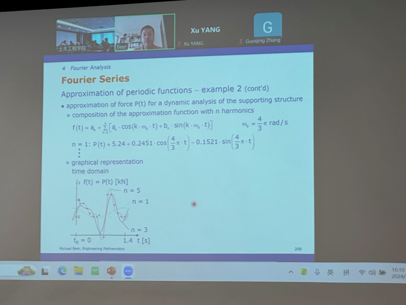 7月15日与17日,德国汉诺威莱布尼兹大学风险与可靠性研究所所长,中国国家外专局高端外国专家,Michael Beer教授分别以 Eigenvalue problem & Numerical Solution of the Fourier Series为主题开展讲座。讲座涉及了矩阵形式的代数问题,从傅里叶分析在工程方面的应用引入,尤其对特征值问题进行了深入的讲解。Prof. Beer详细的介绍了如何通过傅里叶级数来逼近周期函数,并讨论了傅里叶变换在处理非周期函数中的作用,同时还解释了傅里叶变换的基本性质。并在讲座中涉及了快速傅里叶变换(FFT)的算法,展示了如何利用FFT提高计算效率。授课之后就相关问题和同学们进行了交流探讨,解答疑惑。