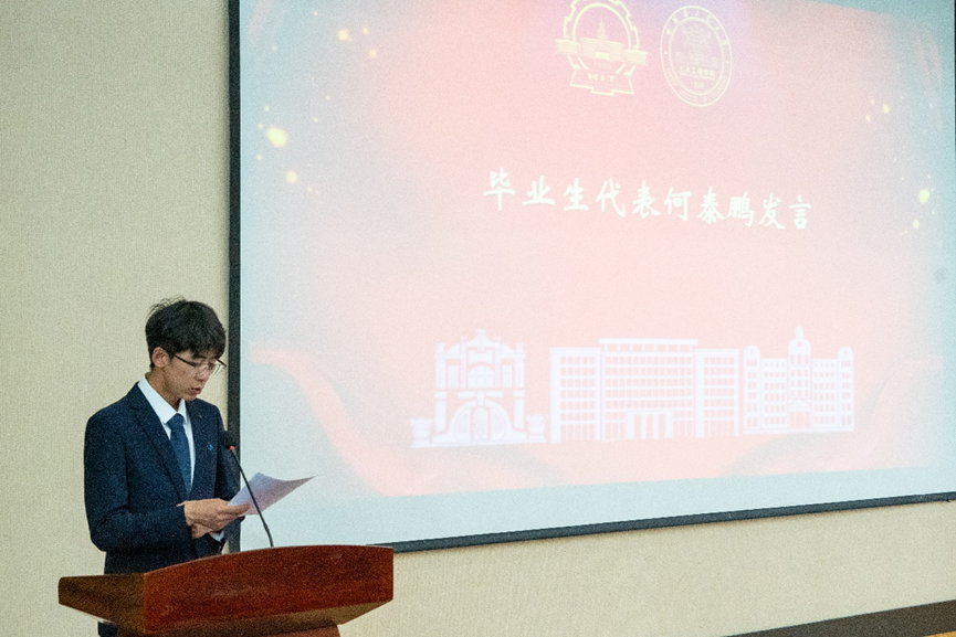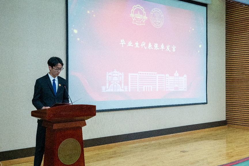 毕业生代表张卓、何泰鹏依次上台发言,两位同学回忆了本科四年的学习生活,表达了对公司、公司和老师四年培养的感恩,还有对过去的不舍和对未来的期望。